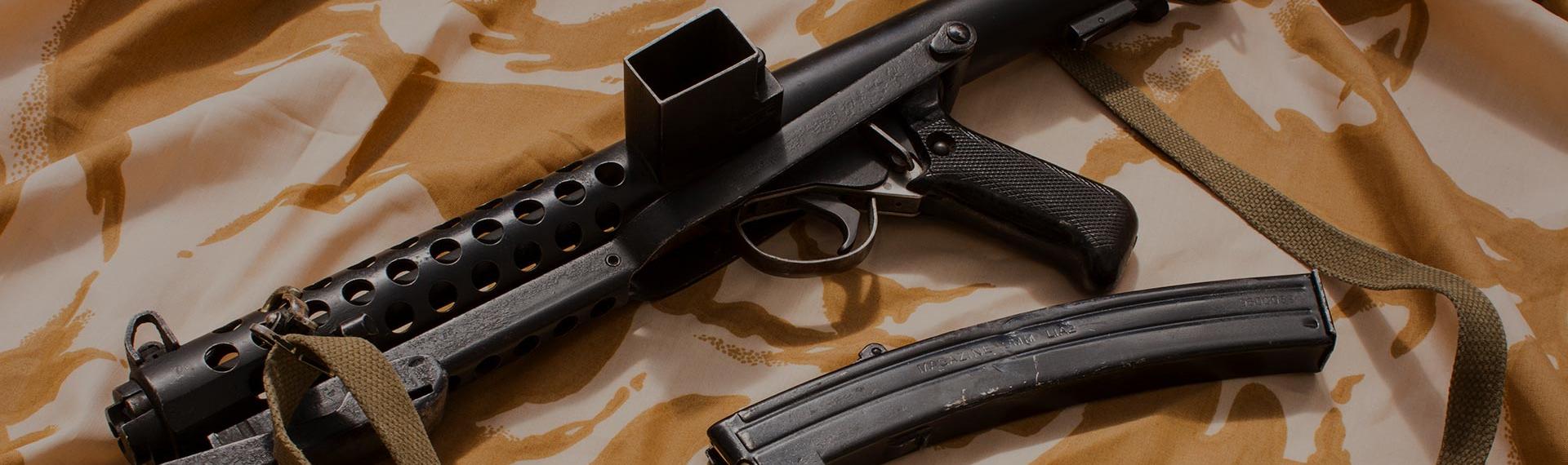 The Sterling submachine gun is a classic British firearm that served the UK armed forces for over four decades. Its distinctive side-mounted magazine and skeleton stock make it instantly recognisable to military enthusiasts.